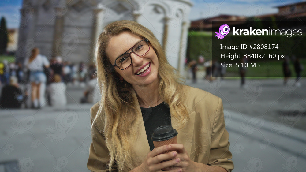 Woman smiling with coffee cup at pisa tower on sunny day in italy, surrounded by tourists, wearing stylish glasses and beige blazer, capturing a joyful outdoor moment. - Kraken Images