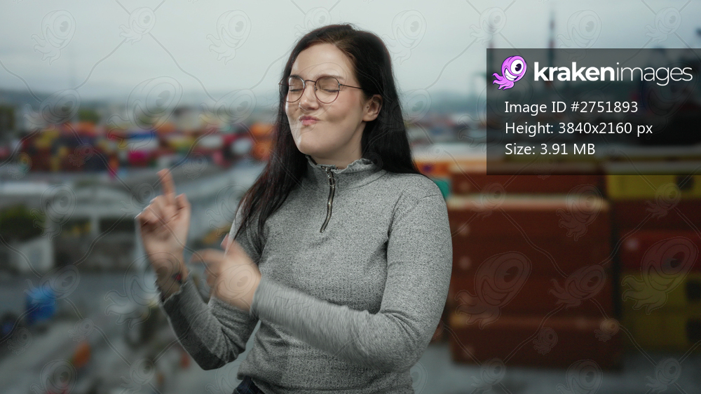 Woman smiling with confidence at port background featuring containers and cranes showing maritime industry context.