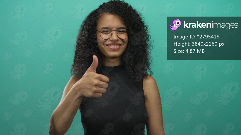 Woman smiling confidently against a vibrant green background with curly hair and glasses, expressing positivity with a relaxed demeanor and isolated setting. - Kraken Images