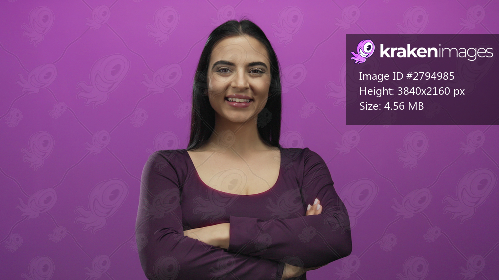 Woman smiling confidently against a vibrant pink background with arms crossed expressing empowerment and positivity.