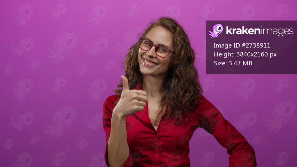 Woman smiling confidently against a vibrant pink background wearing red glasses and shirt.