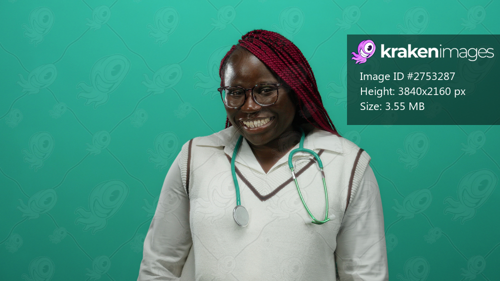 Woman smiling confidently against green background wearing stethoscope, conveying a sense of professionalism and warmth in an isolated setting.
