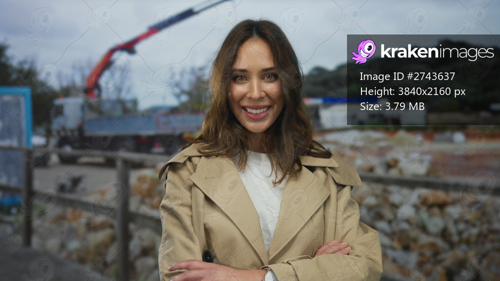 Woman smiling confidently at a construction site with blurred crane and materials in the background under a cloudy sky.