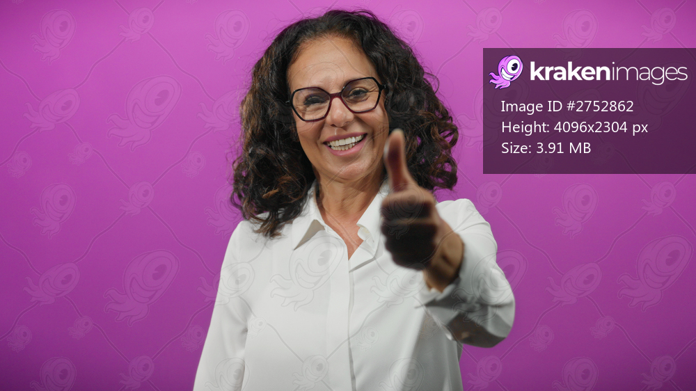 Woman smiling confidently with curly hair giving thumbs up against vibrant purple background showing positivity and success.