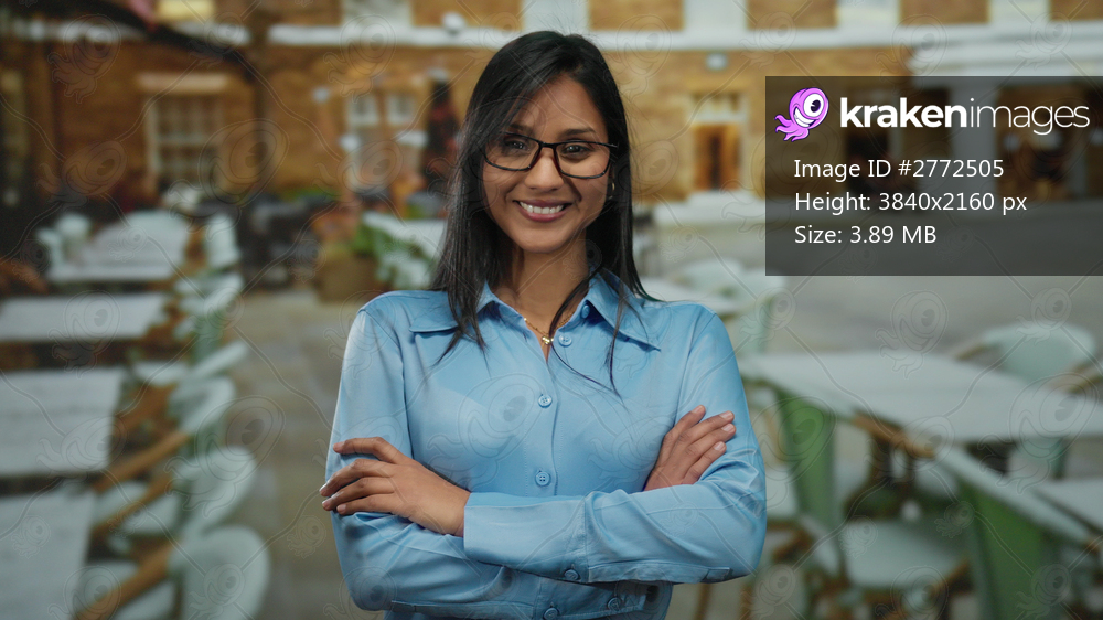 Woman smiling confidently with folded arms on a sunny restaurant terrace, wearing glasses and a blue shirt, capturing the essence of relaxed urban outdoor lifestyle. - Kraken Images