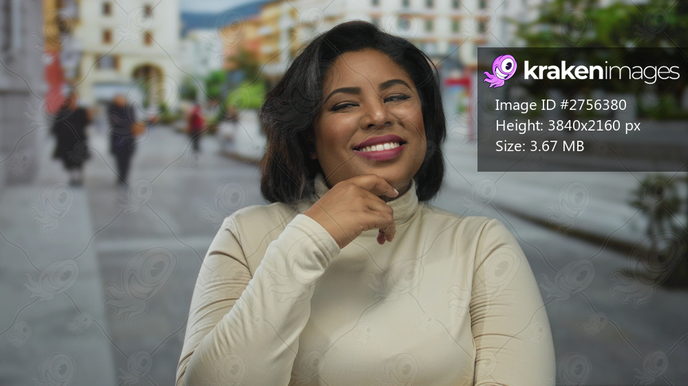 Woman smiling confidently in city street with buildings and people in the background, showcasing urban outdoor lifestyle of young plus size latina.