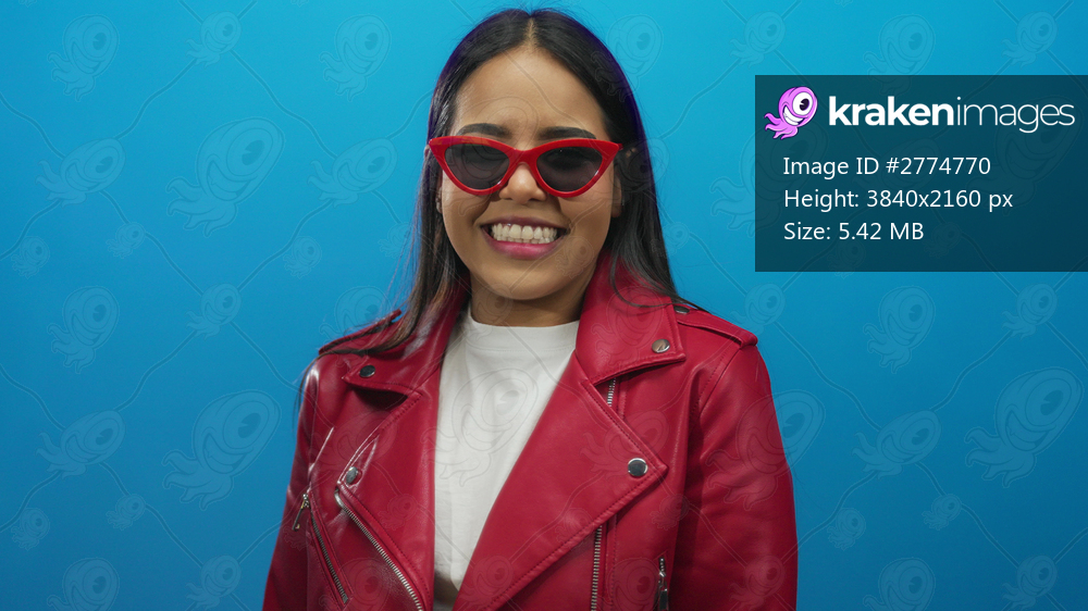 Woman smiling confidently in vibrant red jacket and sunglasses against a vivid blue background, embodying modern fashion with a cheerful expression and stylish flair. - Kraken Images