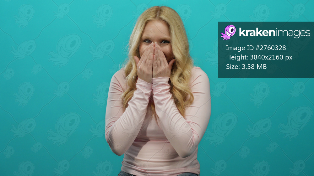 Woman smiling confidently with long blonde hair and a casual pink top against a vibrant blue background, expressing joy and positivity.
