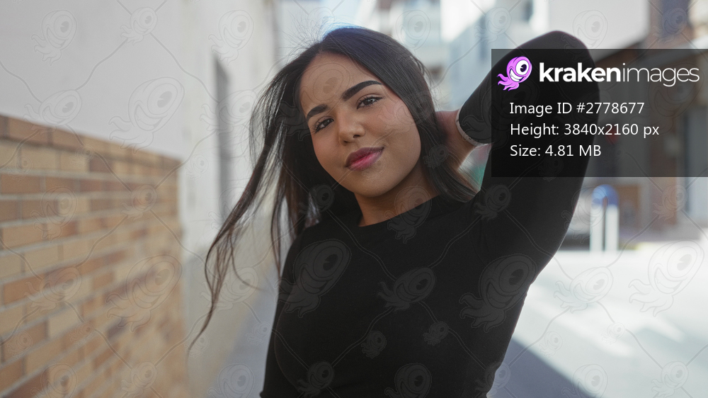 Woman smiling confidently with long dark hair walking down a sunlit urban street wearing casual black clothing exuding youthful energy amidst architectural surroundings outdoors. - Kraken Images