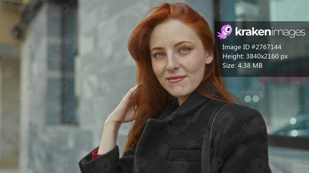 Woman smiling confidently on a city street with long red hair and a black coat against urban backdrop, showcasing beauty and fashion with a modern lifestyle ambiance. - Kraken Images