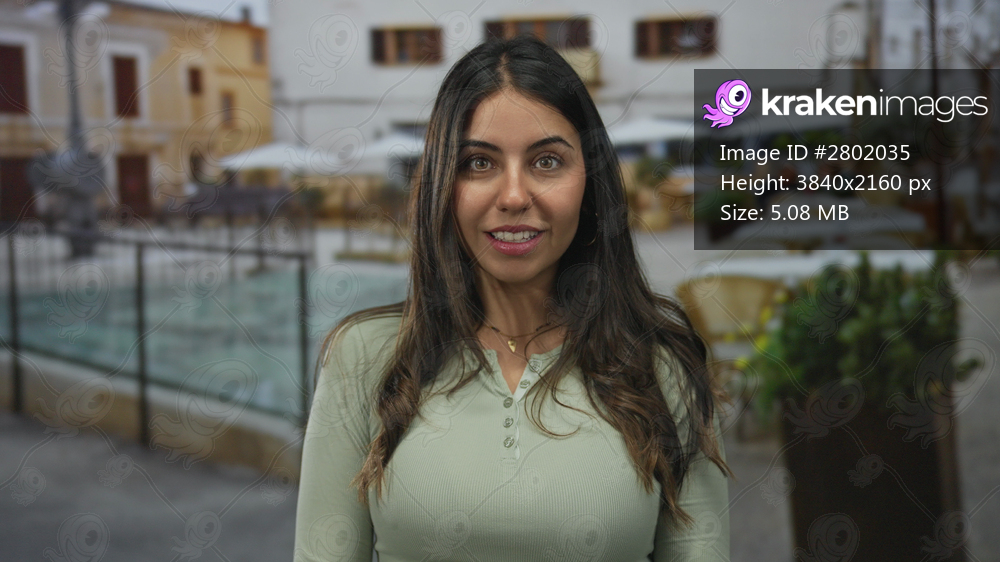 Woman smiling confidently on a sunny day in a charming outdoor restaurant terrace, surrounded by european architecture, exuding happiness and style in a serene street setting. - Kraken Images