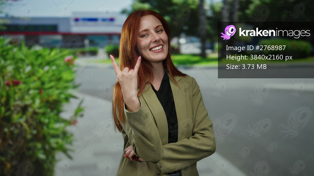 Woman smiling confidently on city street with red hair under blue sky, wearing stylish jacket while showing rock sign and expressing happiness outdoors. - Kraken Images