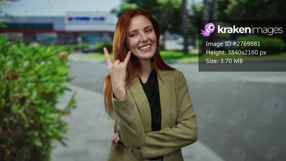 Woman smiling confidently on city street with red hair under blue sky, wearing stylish jacket while showing rock sign and expressing happiness outdoors. - Kraken Images