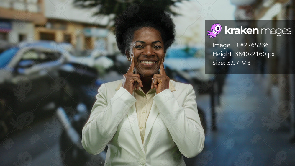 Woman smiling confidently on urban street outdoors wearing white suit emphasizing happiness