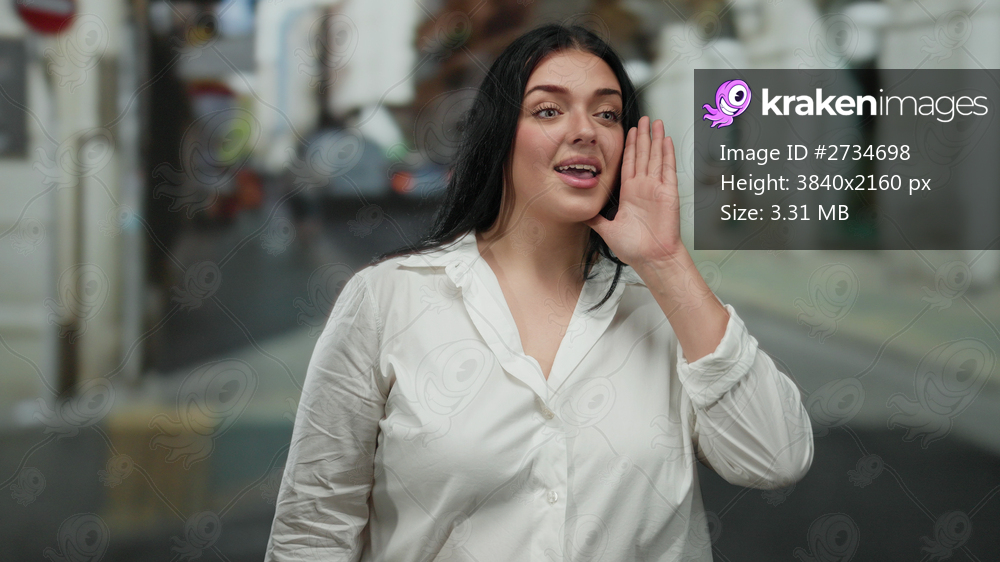 Woman smiling confidently on urban street, wearing white shirt, showcasing plus size fashion in bustling city environment, embodying beauty and confidence outdoors. - Kraken Images