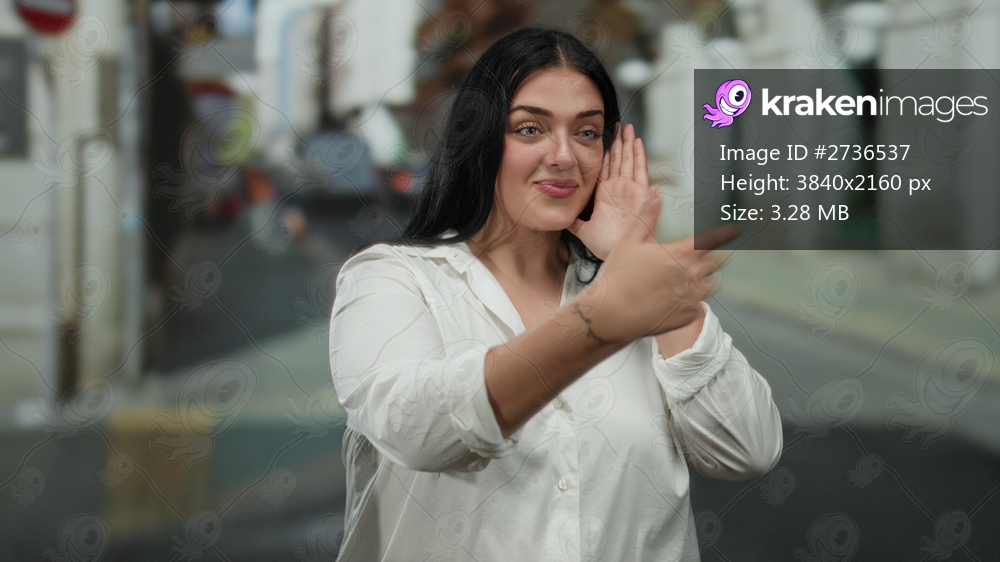 Woman smiling confidently on urban street, wearing white shirt, showcasing plus size fashion in bustling city environment, embodying beauty and confidence outdoors. - Kraken Images
