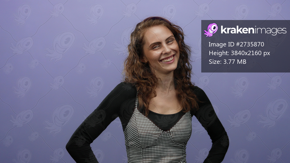 Woman smiling confidently over purple background displaying friendly expression and relaxed demeanor in isolated setting with casual attire and soft lighting. - Kraken Images
