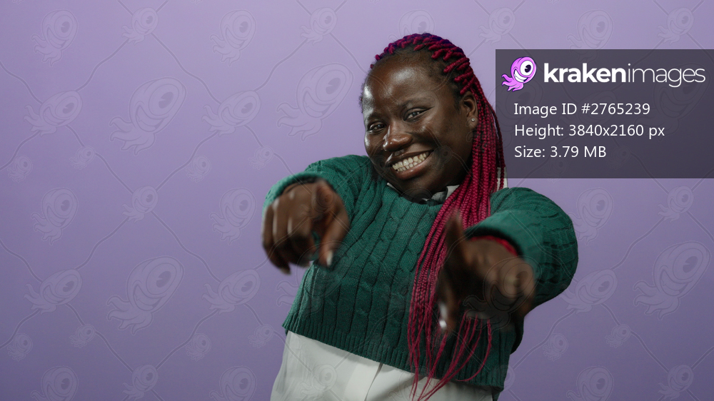 Woman smiling confidently with vibrant red braids and green sweater against a purple isolated background, pointing playfully towards the camera.