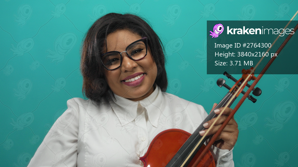 Woman smiling confidently while holding violin against vibrant blue background, highlighting her passion and expression of joy in music.