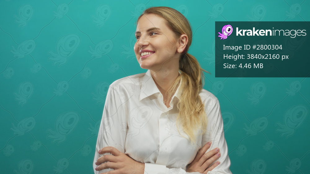 Woman smiling with crossed arms against green background wearing white shirt exuding confidence and positivity, ideal for depicting business or corporate themes. - Kraken Images