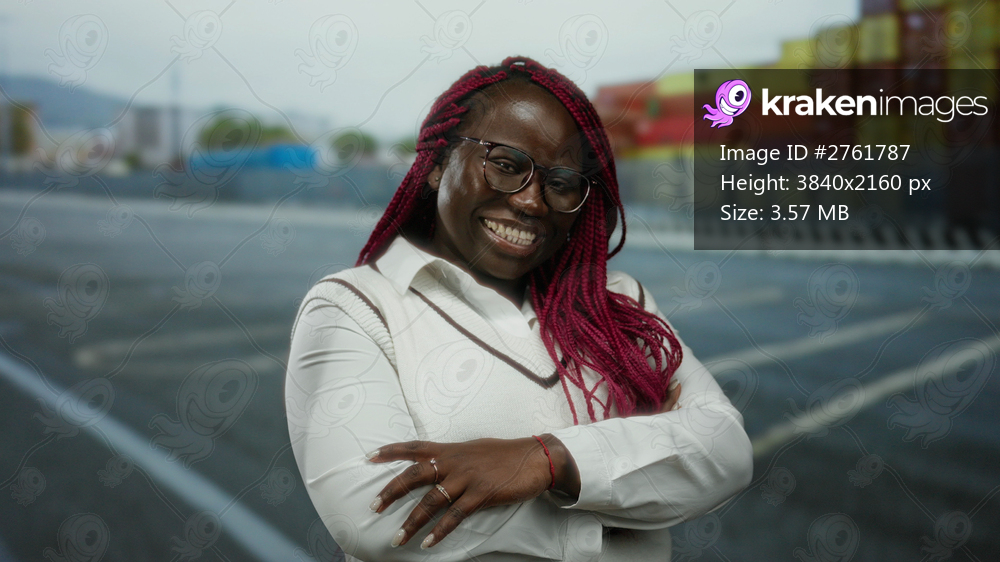 Woman smiling with crossed arms at a port setting, showcasing vibrant hair, glasses, and a white shirt against a backdrop of sea and shipping containers. - Kraken Images