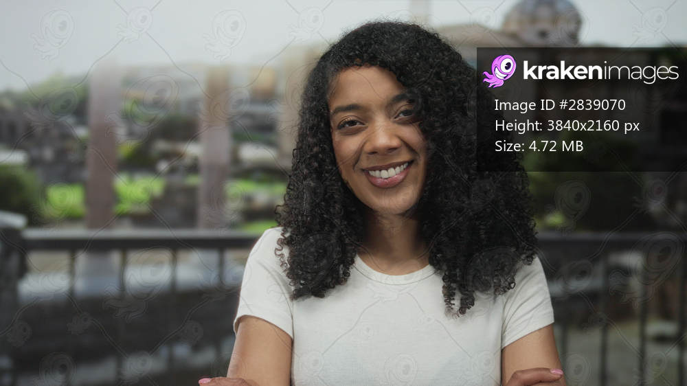 Woman smiling with crossed arms at roman building with stone ruins in bright midday sunlight; confidence.