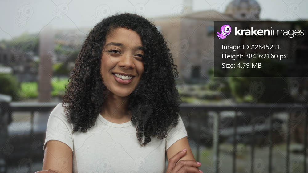 Woman smiling with crossed arms at roman building with stone ruins in bright midday sunlight; confidence.