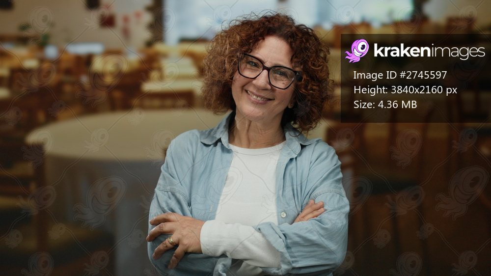 Woman smiling with crossed arms in a cozy restaurant setting, showcasing casual confidence and friendly demeanor.