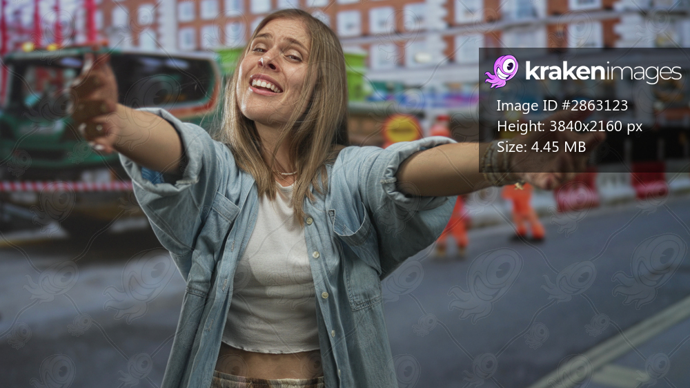 Woman smiling crosses arms across chest revealing bare belly on street under bright daylight; self acceptance.