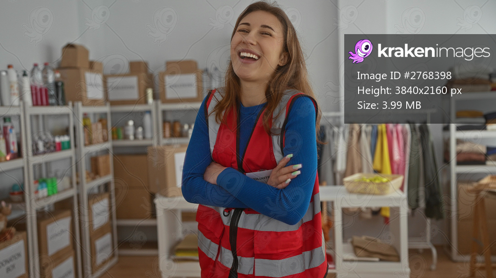 Woman smiling crosses arms in charity center surrounded by donation items showcasing volunteer spirit indoors.
