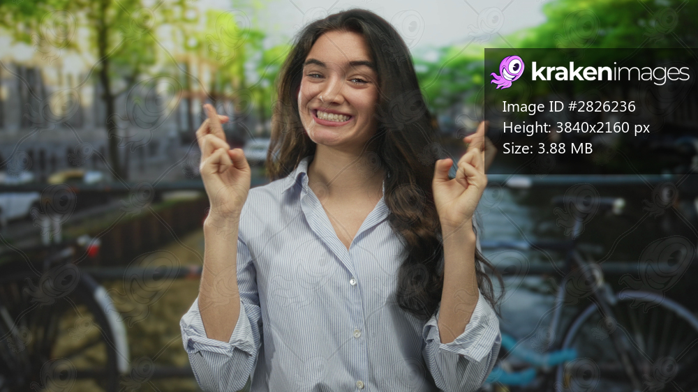 Woman smiling crosses fingers on bridge over canal on an urban street with bicycle rack in view; hope.