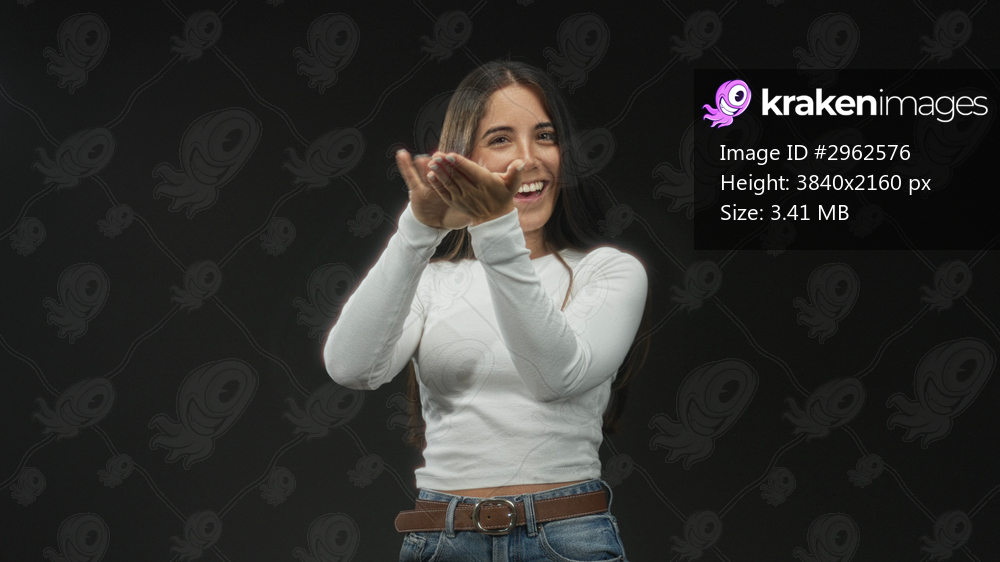 Woman smiling with cupped hands offering toward camera, wearing white top and jeans on a black studio set; warm welcome joy.