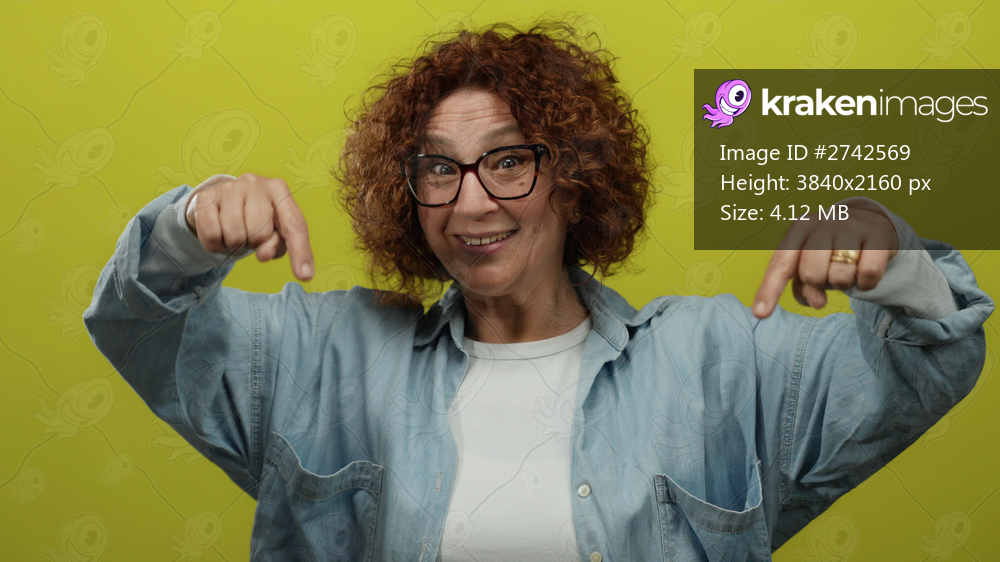 Woman smiling with curly brunette hair, wearing glasses and a blue shirt, enthusiastically gesturing downward in front of an isolated yellow background. - Kraken Images