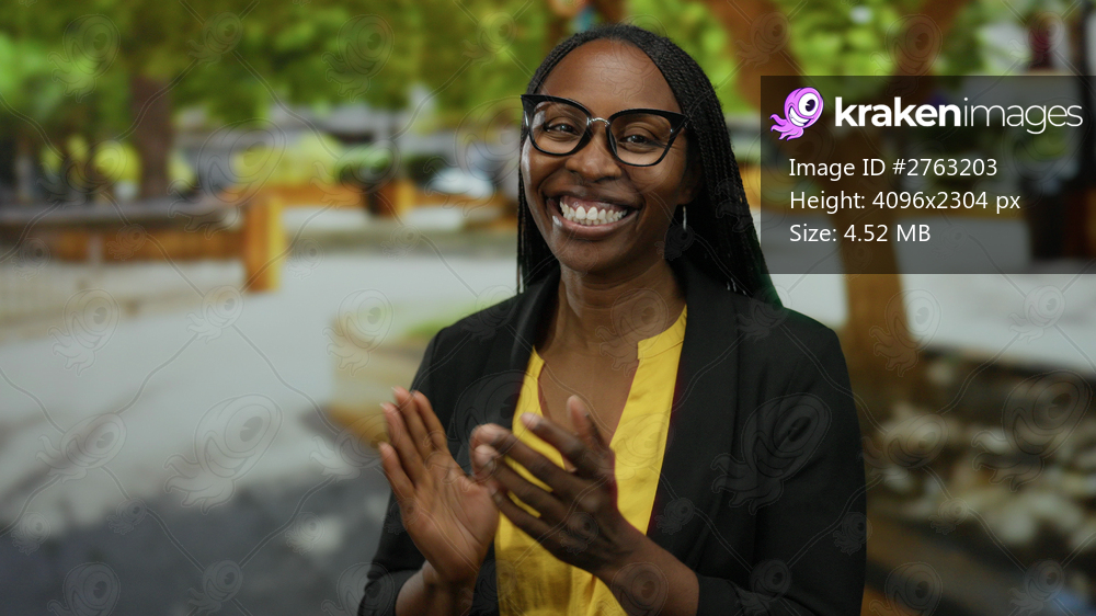 Woman smiling with curly hair at outdoor park setting, wearing glasses and yellow shirt, surrounded by trees in a vibrant green environment, showcasing joy and relaxation. - Kraken Images