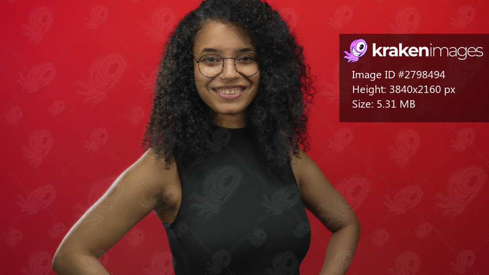 Woman smiling with curly hair and glasses in front of a vibrant red background, embodying confidence and warmth in a youthful and dynamic setting.