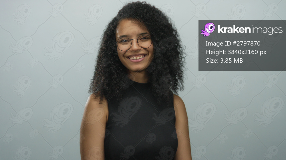 Woman smiling with curly hair and glasses isolated against a gray background creates a cheerful and friendly atmosphere showcasing a modern professional appearance. - Kraken Images