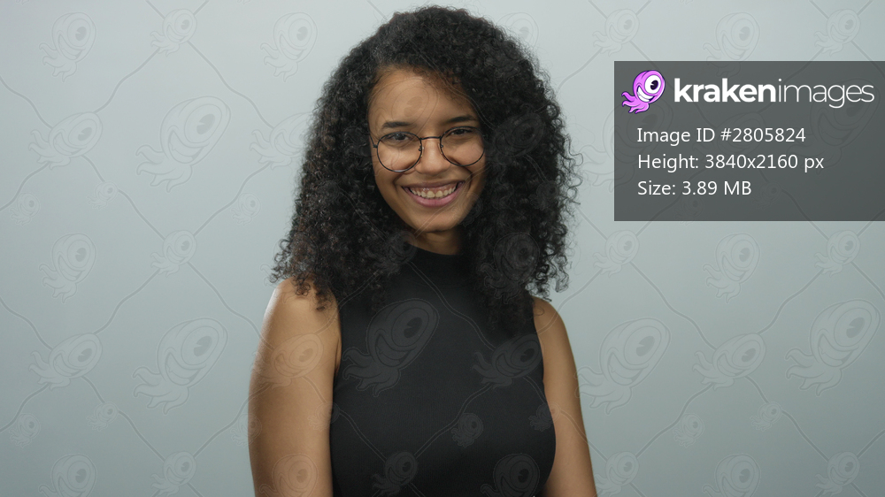 Woman smiling with curly hair and glasses isolated against a gray background creates a cheerful and friendly atmosphere showcasing a modern professional appearance. - Kraken Images