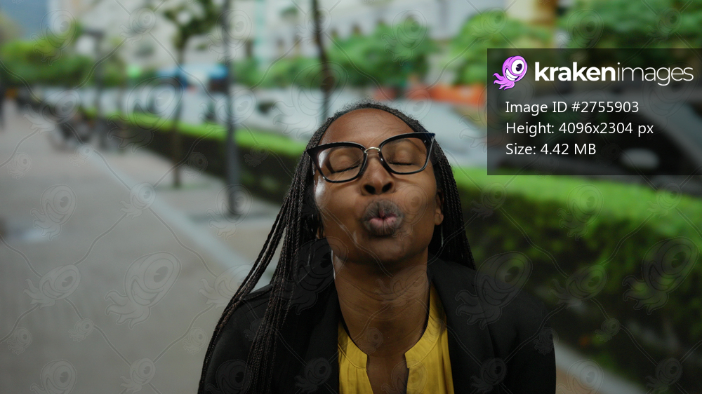 Woman smiling with curly hair and glasses makes heart with hands outdoors on urban street in vibrant yellow shirt exuding joy and positivity.