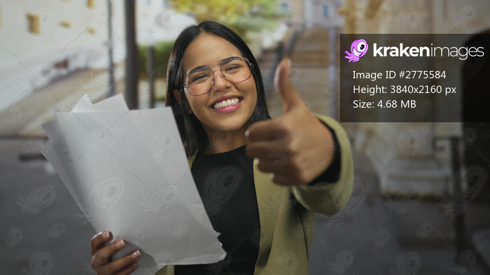 Woman smiling with documents in old town, showcasing happiness and success, wearing glasses and business attire while standing outdoors during daytime. - Kraken Images