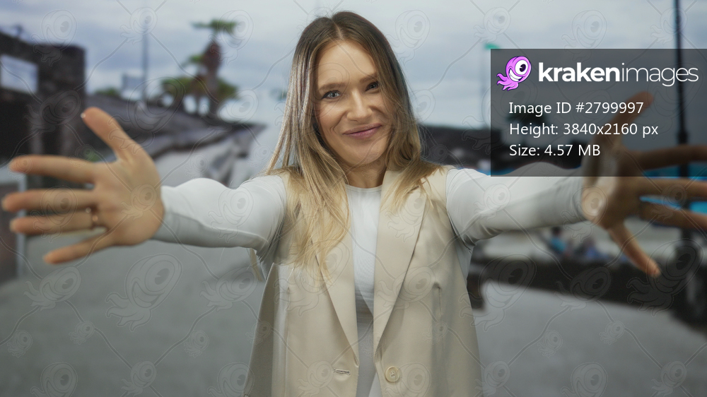 Woman smiling and embracing herself joyfully at a seaside location, with a blurred background of blue umbrellas and a beach ambiance suggesting relaxation. - Kraken Images