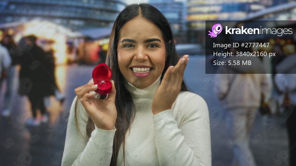 Woman smiling with engagement ring in red box on street evening lights city background facial expression.