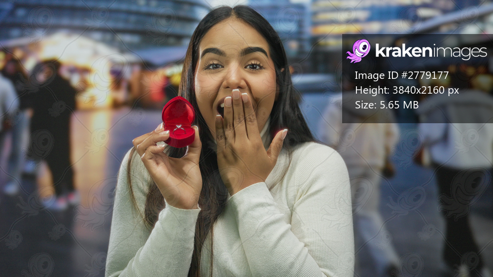 Woman smiling with engagement ring in red box on street evening lights city background facial expression.