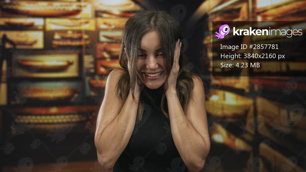 Woman smiling enthusiastically and framing face with hands inside a naval ship museum building; excitement.