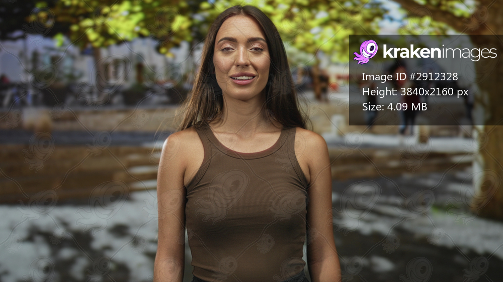 Woman smiling with exposed shoulders standing on a city street plaza facing camera in sunlight; warm contentment.