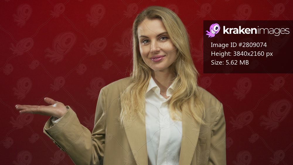 Woman smiling with extended hand in a beige blazer against vibrant red background.