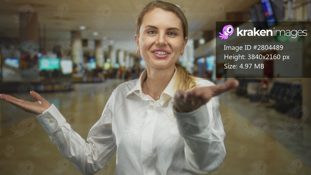 Woman smiling and extending arms inside an airport terminal showcasing bright atmosphere and lively ambiance.