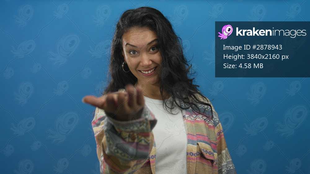 Woman smiling and extending hand toward camera in blue studio setting wearing patterned jacket and white t shirt; invitation friendly warmth.