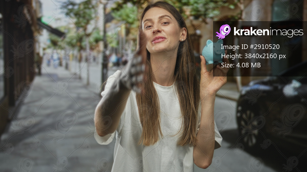 Woman smiling extends hand for handshake while holding a blue piggy bank on a street wearing a white t shirt; financial confidence.