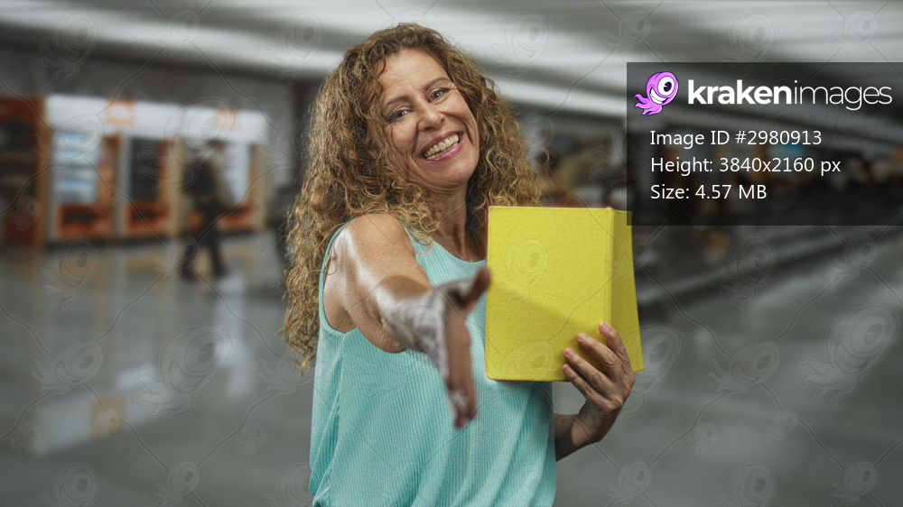 Woman smiling extends hand and holds a yellow book in a busy airport concourse reaching toward camera; welcoming.