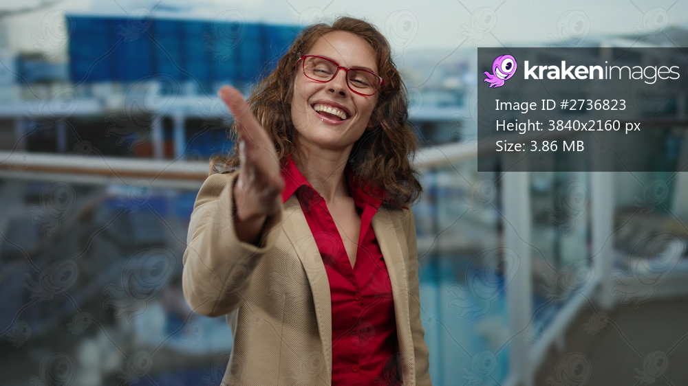 Woman smiling extends hand on a cruise ship with scenic seaside views wearing a stylish suit enhancing a welcoming and friendly atmosphere on deck.